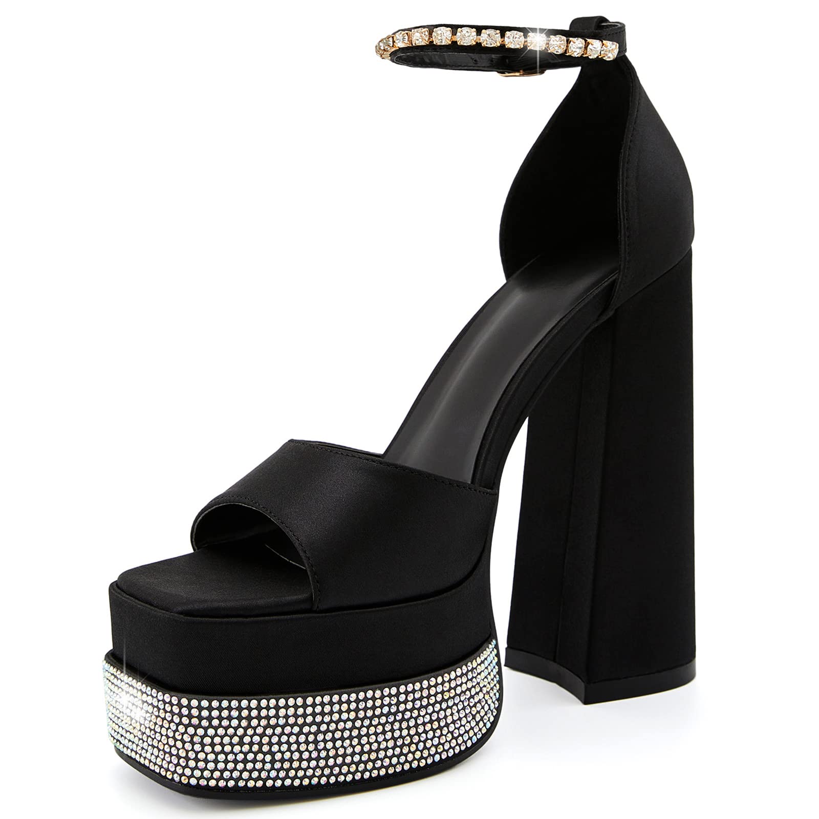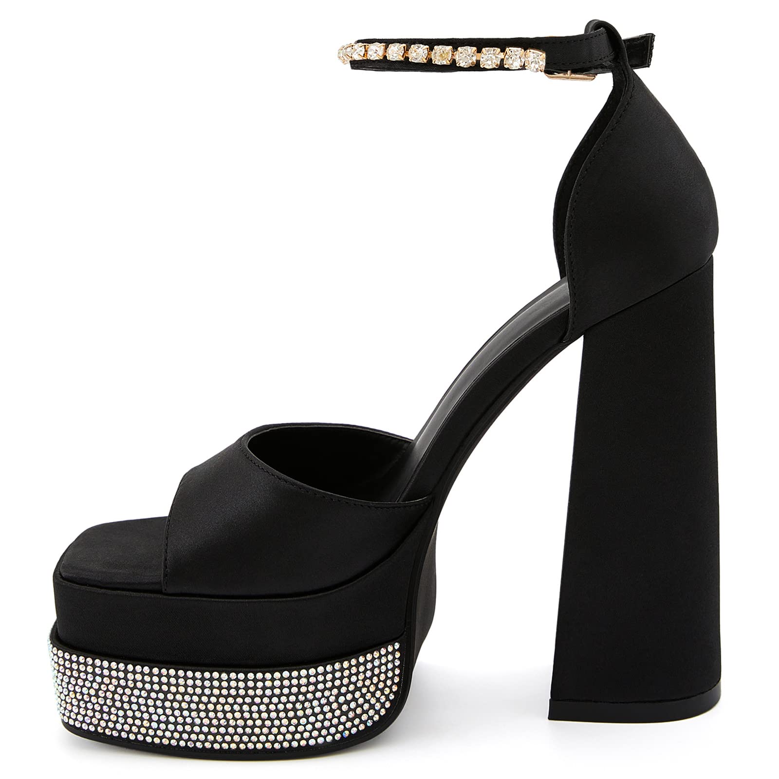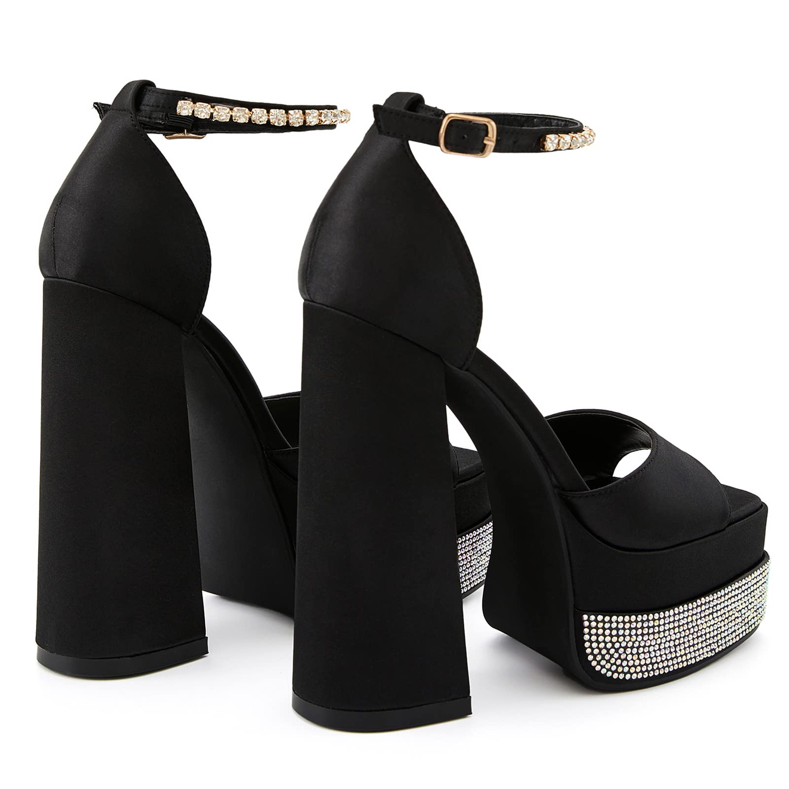 Women'S Platform High Heels Pumps Chunky Block Square Closed Toe Ankle Strap Buckle Satin/Patent Black Rhinestones Party Prom Dress Mary Jane Shoes