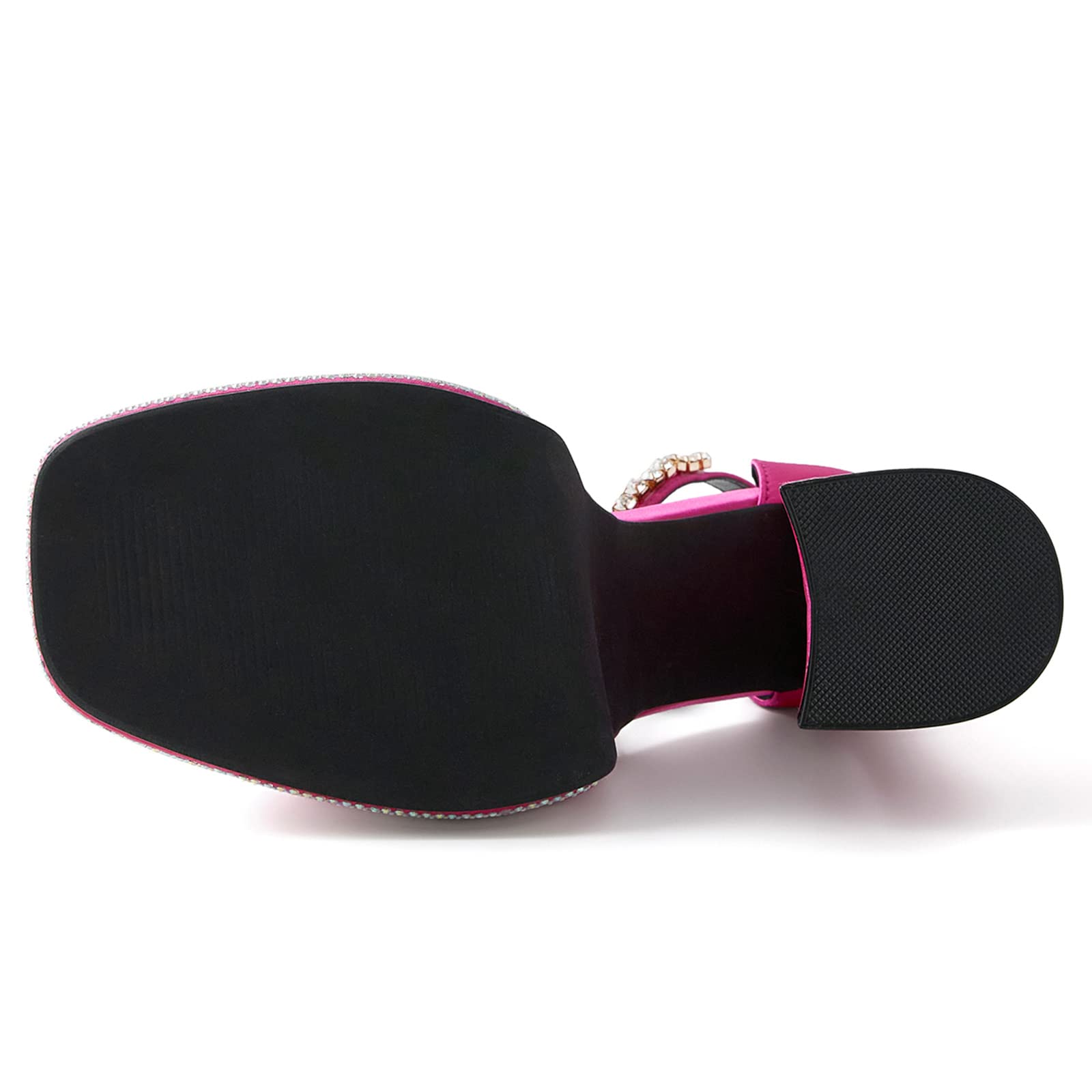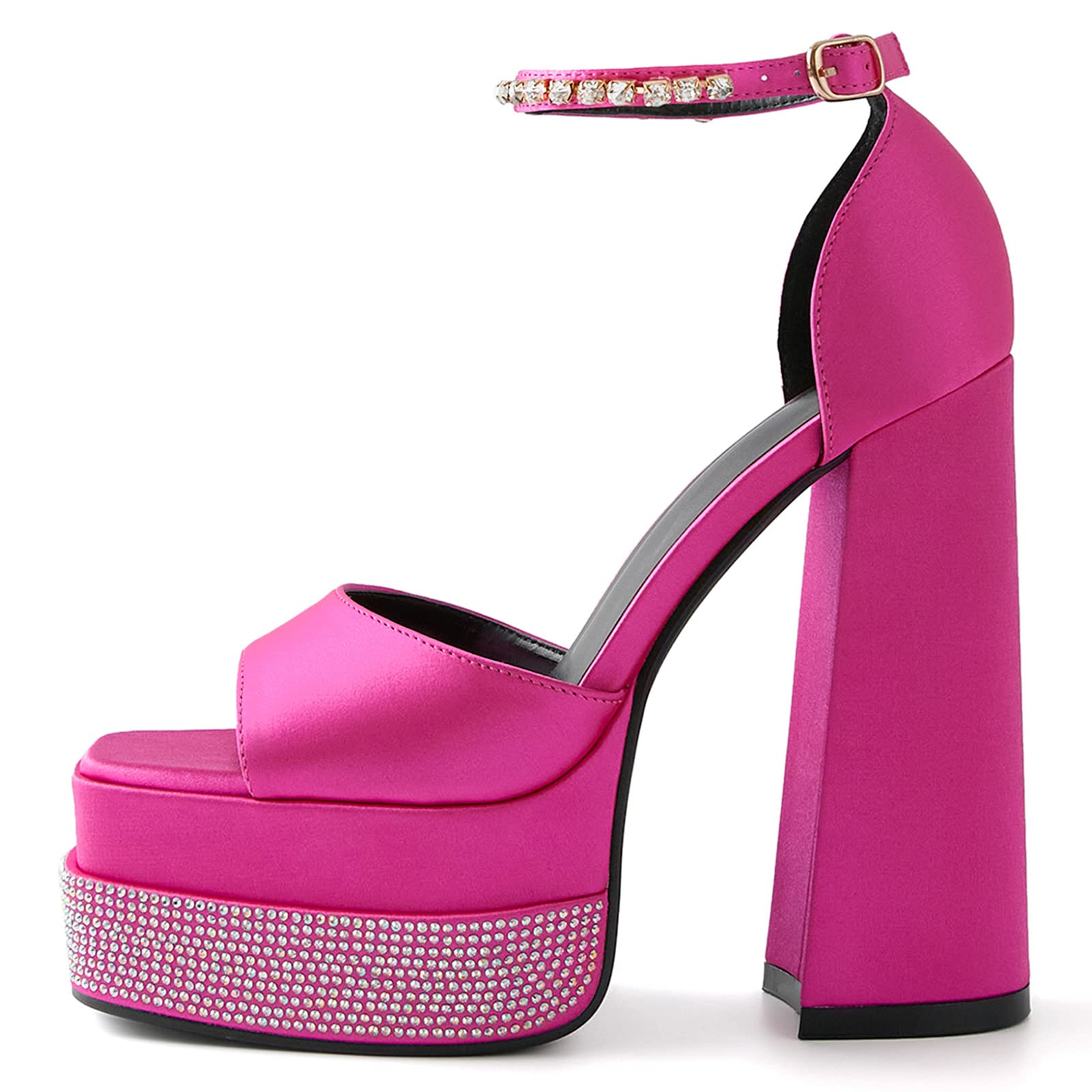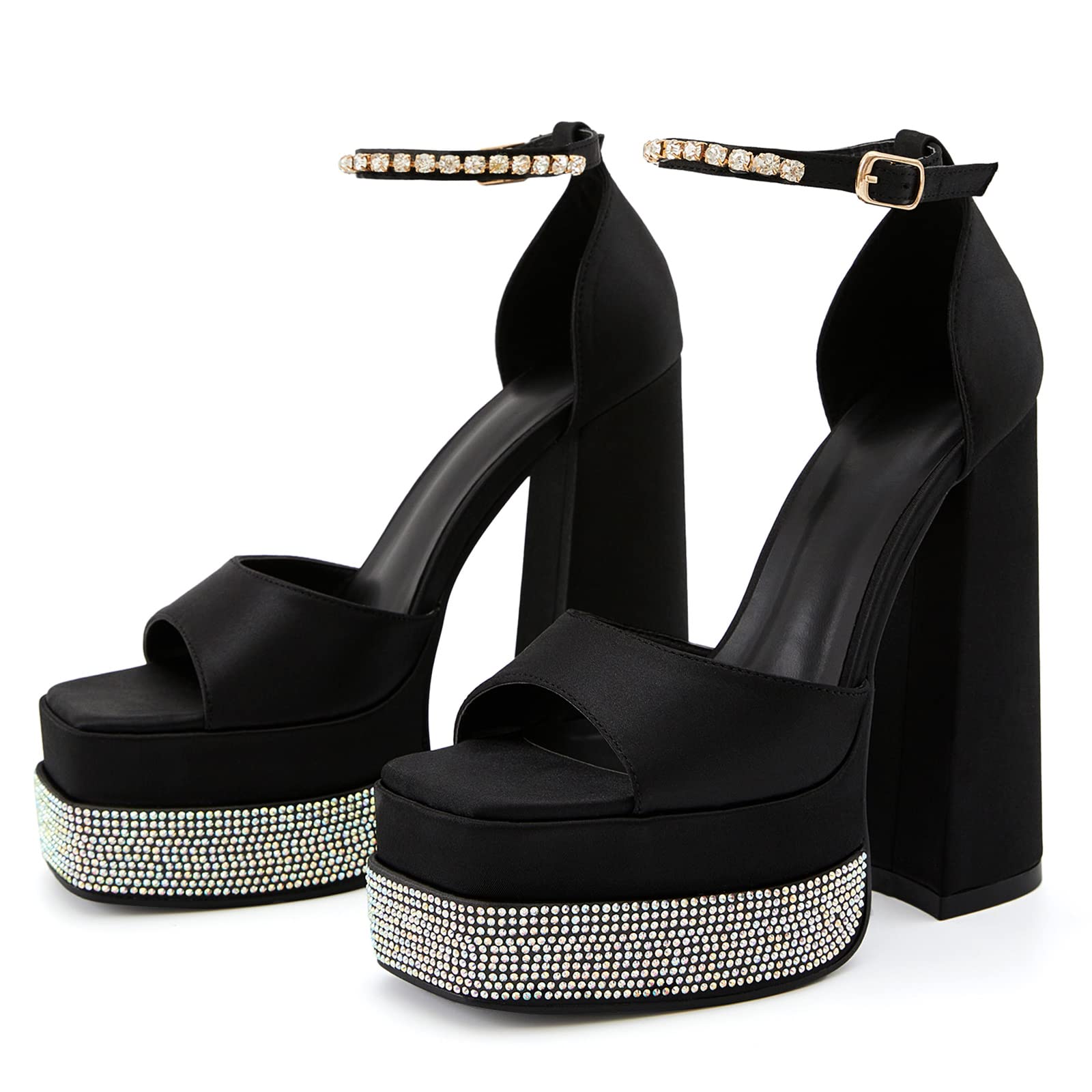 Women'S Platform High Heels Pumps Chunky Block Square Closed Toe Ankle Strap Buckle Satin/Patent Black Rhinestones Party Prom Dress Mary Jane Shoes